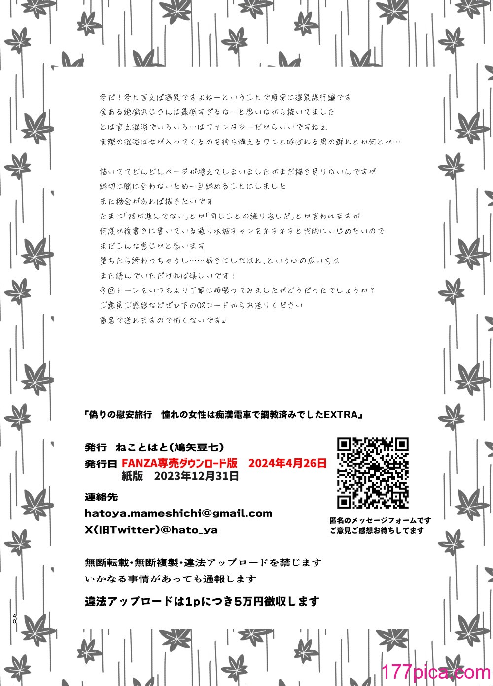 • 在〈[ねことはと (鳩矢豆七)] 偽りの慰安旅行 憧れの女性は痴●電車で調教済みでしたEXTRA [DL版][42P]〉中留言功能已關閉